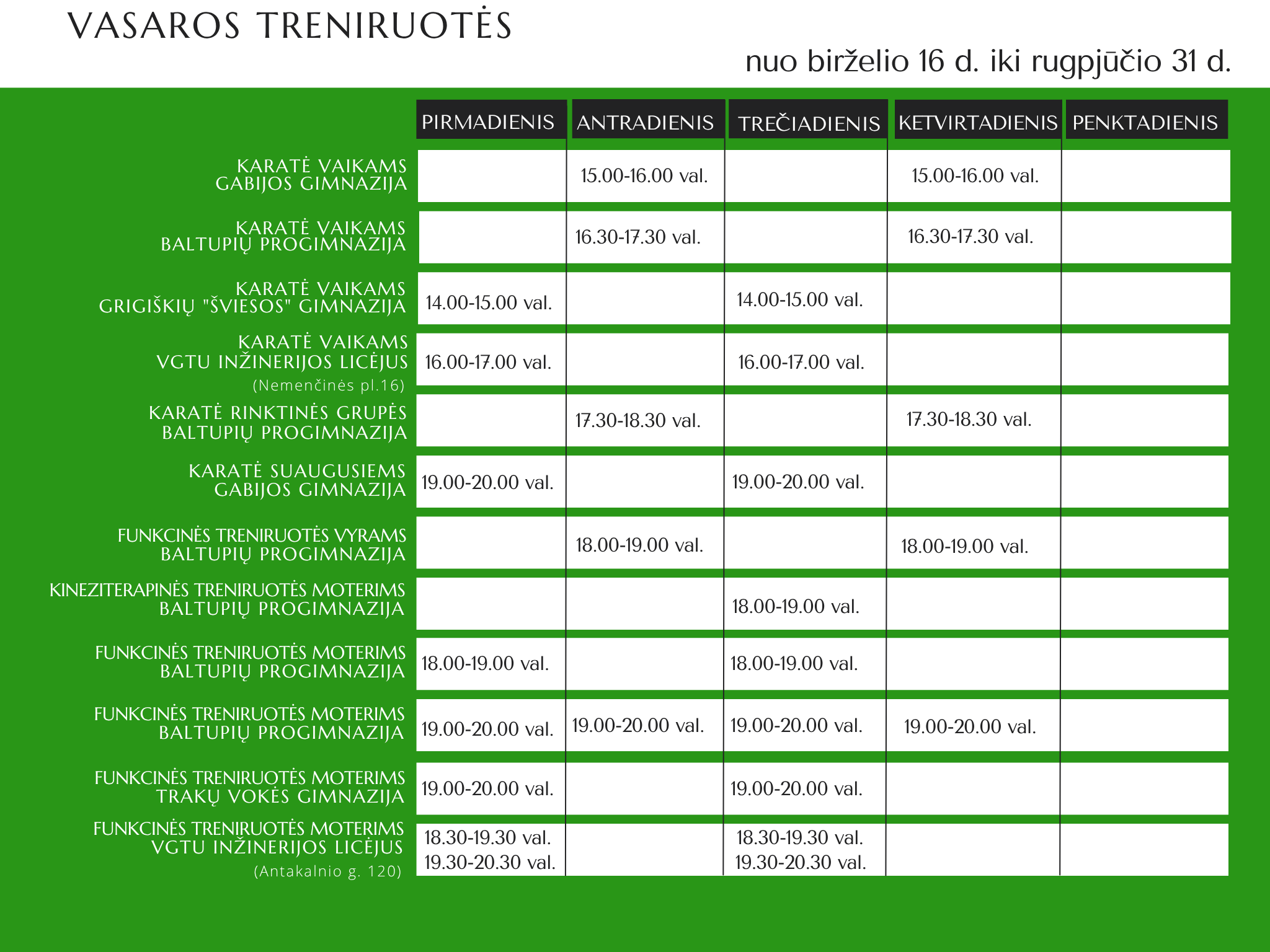 Nuo birželio 16 d. visą vasarą treniruosimės pagal šį tvarkaraštį.